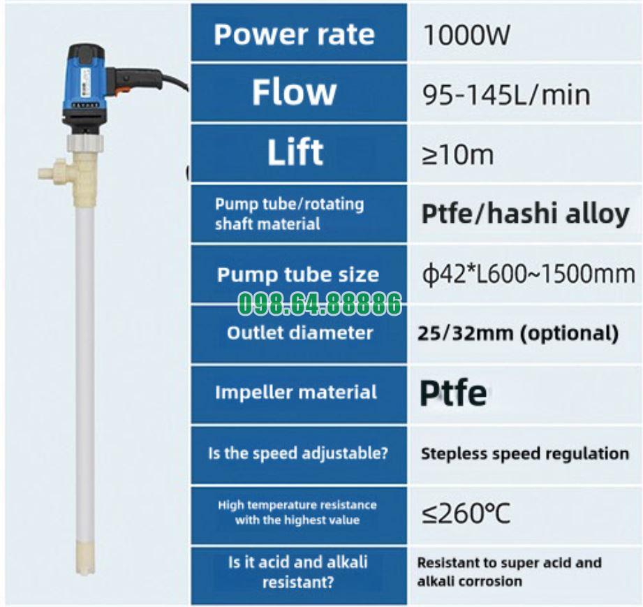 Bơm điện nhúng thùng phuy hóa chất chống ăn mòn model JDT-1000W-PTFE dùng để bơm axit sunfuric là giải pháp an toàn và hiệu quả cho các ứng dụng công nghiệp yêu cầu bơm hóa chất ăn mòn mạnh. Với vật liệu PTFE chống ăn mòn, thiết kế nhúng thùng phuy và công suất ổn định, thiết bị này đáp ứng tốt yêu cầu vận hành, góp phần nâng cao hiệu quả sản xuất và đảm bảo an toàn lâu dài.