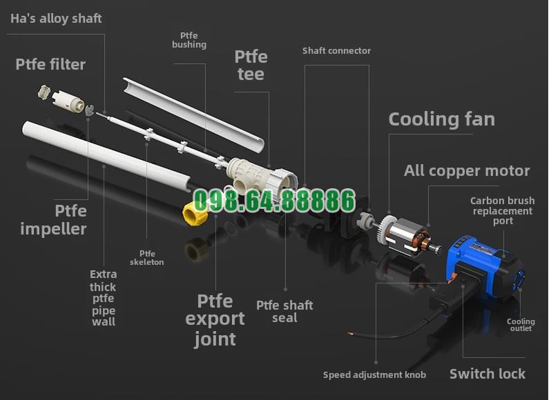 PTFE còn có thể chịu được nhiệt độ lên đến khoảng 260°C, giúp thiết bị hoạt động ổn định khi bơm các chất lỏng nóng trong môi trường sản xuất công nghiệp.