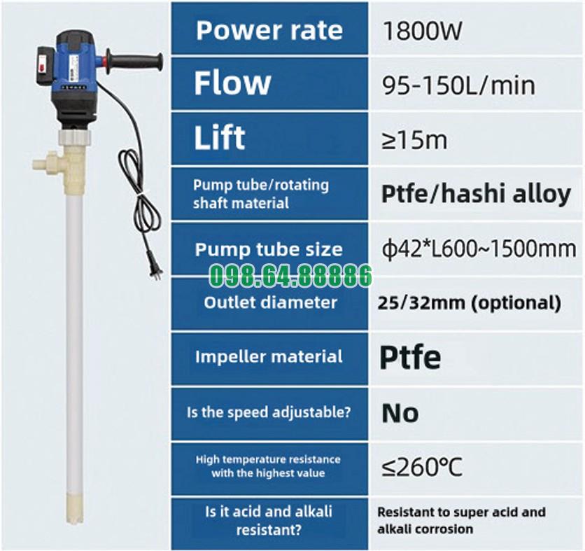 Tại sao Bơm điện thùng phuy 200L JDT-1800W-PTFE có khả năng bơm liên tục là nhờ động cơ 1800W chịu tải tốt, cơ chế bơm ly tâm ổn định, trục truyền động chắc chắn và vật liệu PTFE chống ăn mòn hiệu quả. Sự kết hợp giữa công suất mạnh và thiết kế bền bỉ giúp thiết bị vận hành lâu dài, duy trì lưu lượng ổn định và đáp ứng yêu cầu sản xuất liên tục trong môi trường hóa chất khắc nghiệt.