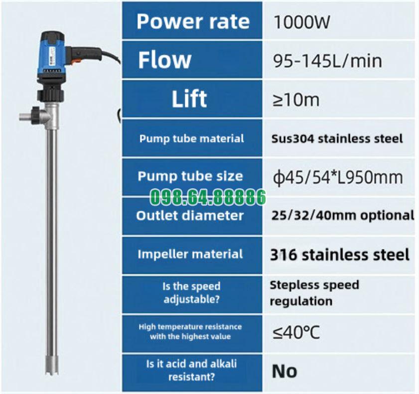 Bơm cắm điện thùng phuy JDT-1000W-304SUS được thiết kế để bơm trực tiếp chất lỏng từ thùng phuy. Với các loại dung môi dạng lỏng thông dụng, bơm có thể: