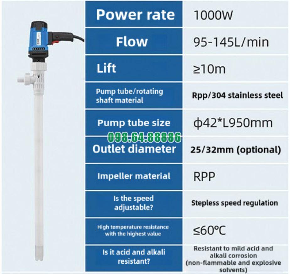 Với công suất 1000W, bơm cắm điện thùng phuy model JDT-1000W-PVDF sở hữu ưu thế vượt trội về khả năng bơm mạnh, làm việc liên tục, xử lý linh hoạt nhiều điều kiện vận hành và nâng cao năng suất sản xuất. Đây là lựa chọn phù hợp cho các doanh nghiệp cần thiết bị bơm hóa chất hiệu quả và bền bỉ.