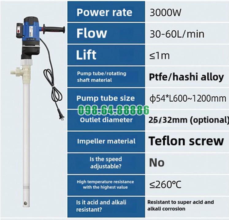 Bơm hút hóa chất công nghiệp thùng phuy JDT-3000W-PTFELG