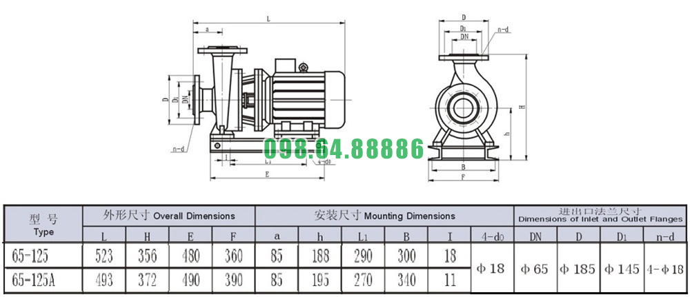 Bảng thông số kỹ thuật bơm nước nằm ngang SLW-ISW65-125 vòng quay 2900 r/min