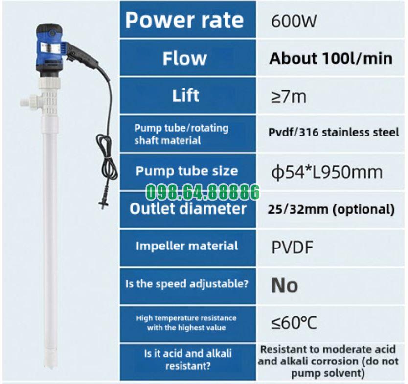 Bơm phuy trục thép không gỉ 316 JDT-600W-PVDF