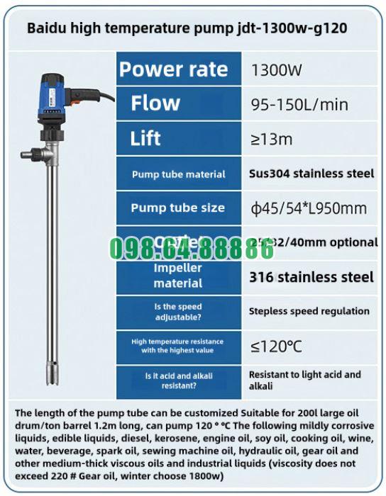 Động cơ của bơm thùng phuy nhiệt độ cao JDT-1300W-G120 được tính toán công suất phù hợp: