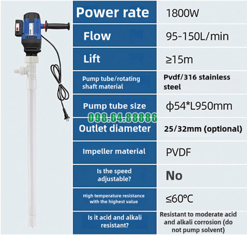 Dù có thiết kế nhỏ gọn, Máy bơm điện bơm chất lỏng thùng phuy JDT-1800W-PVDF vẫn được trang bị ống bơm có chiều dài khoảng 950 mm.