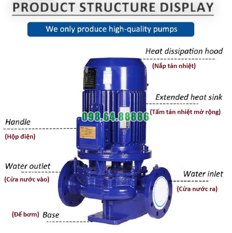 Máy bơm inline, bơm ly tâm, bơm hút xả đặt nằm thẳng ISG80-350A, IRG80-350A 45kw, 44m3, 142m